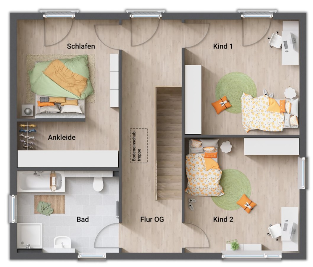 Auch das Obergeschoss zeigt sich im gradlinigen Baustil des Hauses. Hier finden Sie drei Zimmer, die Sie nach Ihren Vorstellungen als Schlaf-, Kinder- oder Gästezimmer nutzen können. Große Fenster lassen auch hier viel Tageslicht hineinströmen. Die Ankleide im Schlafzimmer bietet viel Stauraum.