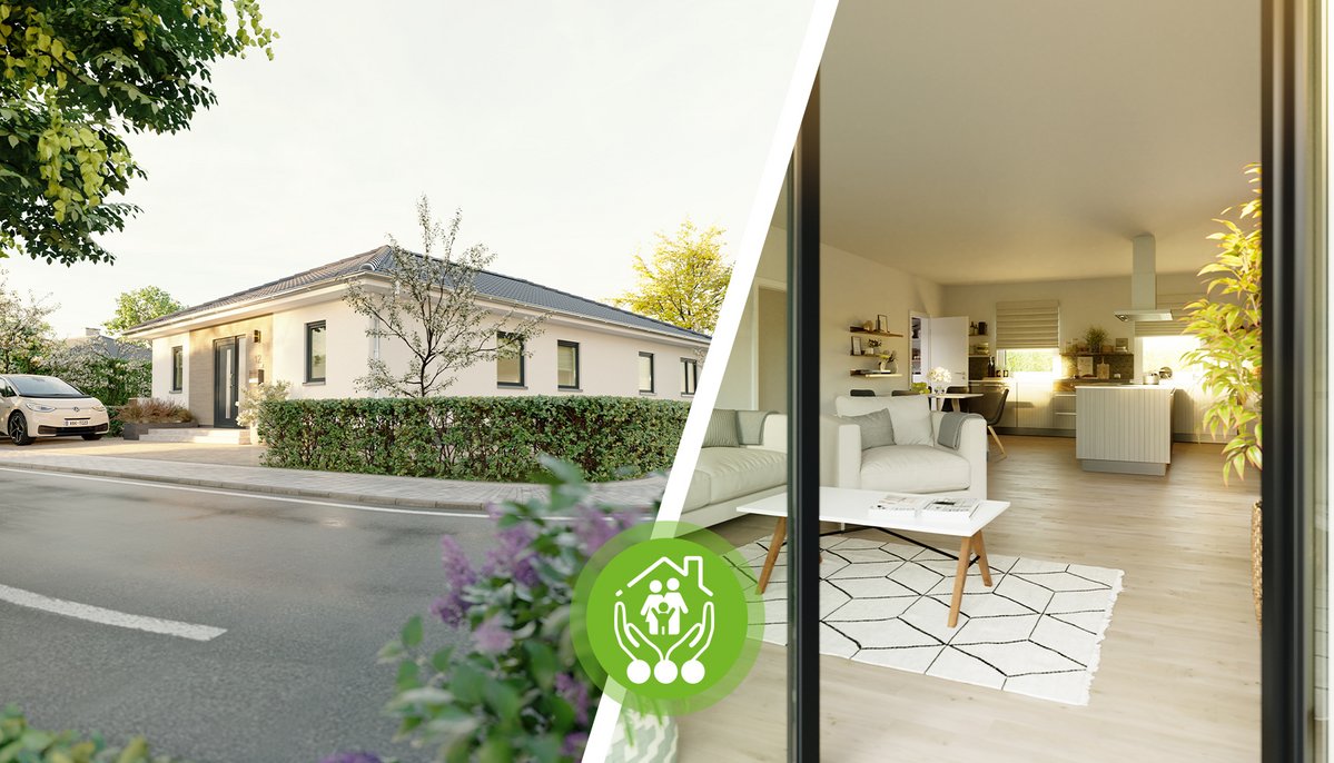Der Bungalow überzeugt durch sein barrierearmes Design. Alle Räume befinden sich auf einer Ebene, was nicht nur den Alltag mit kleinen Kindern erleichtert, sondern auch langfristig Komfort bietet. Ob Kinderzimmer, Homeoffice oder Gästezimmer – die drei flexibel nutzbaren Schlafzimmer passen sich Ihren Bedürfnissen an. Der offene Wohn- und Essbereich mit angrenzender Küche wird zum Herzstück des Familienlebens, während bodentiefe Fenster für lichtdurchflutete Räume sorgen. Eine stylische Lofttür trennt den Eingang vom Wohnbereich und ermöglicht so ein ungestörtes Familienleben. Auch morgens spüren Sie den Komfort des Hauses, wenn Sie dank der zwei Waschtische im Hauptbad nicht länger vor der Badezimmertür Schlange stehen müssen.